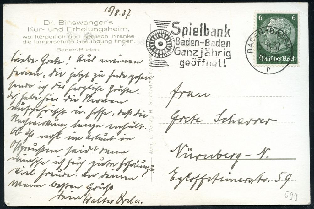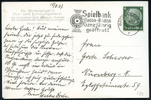 5061 | 15 € | POSTLEITRAUM 7500 (OHNE KARLSRUHE u. PFORZHEIM) : BADEN-BADEN 1/ r/ Spielbank../ Ganzjährig geöffnet! 1937 (15.8.) MWSt mit UB "r" (Roulette) klar gest. s/w.-Foto-Ak.: Dr. Binswanger´s Kur- u. Erholungsheim.., Bedarf (Bo.23 A I , nur 1937-39 verwendet) | ![]() ![]() | |