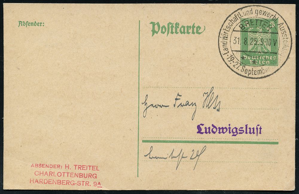 5091 | 18 € | POSTLEITRAUM 7500 (OHNE KARLSRUHE u. PFORZHEIM) : BRETTEN/ ***/ Landwirtschaftl.u.gewerbl.Ausstellung/ 19.-27.Sept. 1925 (31.8.) HWSt klar auf Inl.-Karte (Bo.1) | ![]() | |