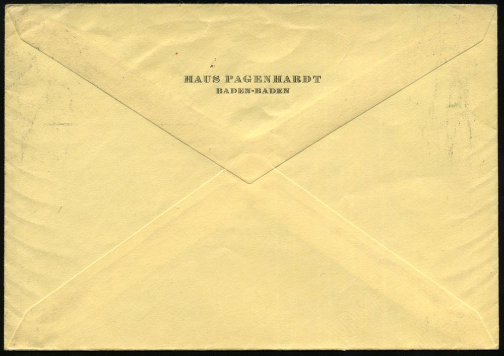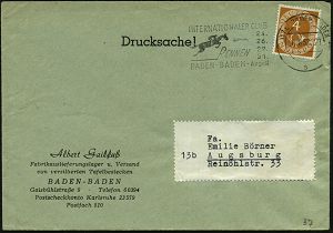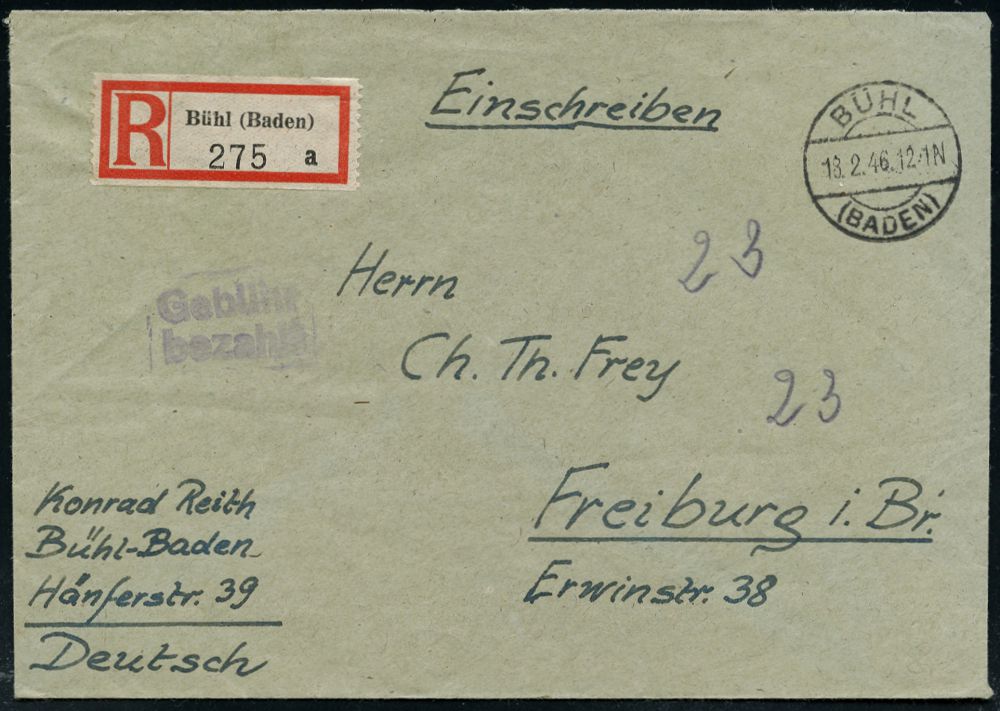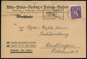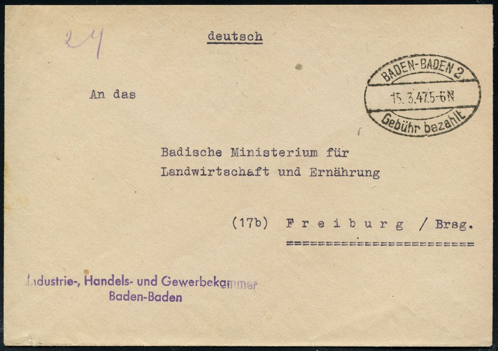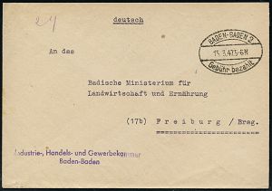 5073 | 12 € | POSTLEITRAUM 7500 (OHNE KARLSRUHE u. PFORZHEIM) : BADEN-BADEN 2/ Gebühr bezahlt 1947 (15.3.) schwarzer Oval-Brücken-PFS klar auf Dienst-Bf.: Industrie-, Handels- u. Gewerbekammer.. n. Freiburg (Dü.A-5 Nr.17 b, schwarz) | ![]() | |