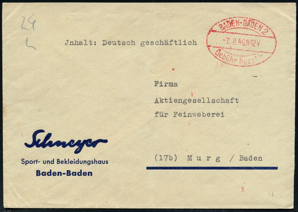 5072 | 12 € | POSTLEITRAUM 7500 (OHNE KARLSRUHE u. PFORZHEIM) : BADEN-BADEN 2/ Gebühr bezahlt 1947 (9.8.) roter Oval-Brücken-PFS mit Uhrzeit (ohne Wertziffer) klar auf Firmen-Fern-Bf.: Schneyer Sport- u. Bekleidungshaus (Dü.A-5, Nr.17 b, rot) | ![]() | |