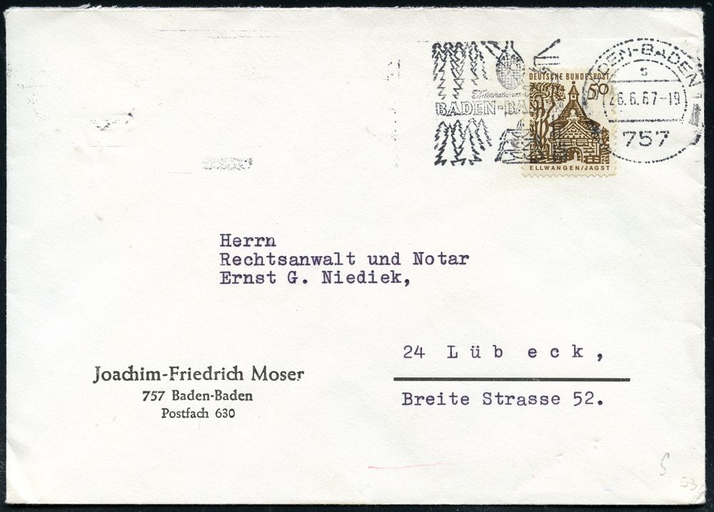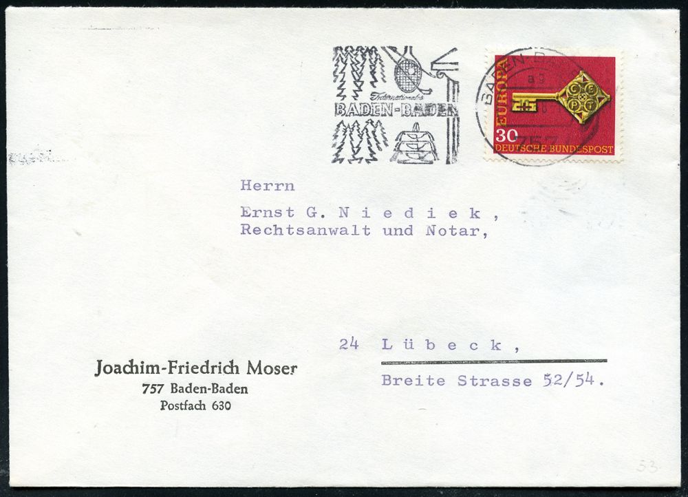 5078 | 12 € | POSTLEITRAUM 7500 (OHNE KARLSRUHE u. PFORZHEIM) : 757 BADEN-BADEN 1/ ag/ Internationales/ BADEN-BADEN 1966 (2.10.) MWSt (Tennis- u. Golf-Schläger) Vordruck-Bf.: Joachim-Friedrich Moser.. (Bo.53 A II = UB "ag") | ![]() | |
