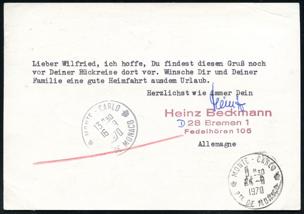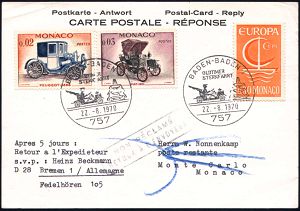 5080 | 20 € | POSTLEITRAUM 7500 (OHNE KARLSRUHE u. PFORZHEIM) : 757 BADEN-BADEN 1/ OLDTIMER/ STERNFAHRT 1970 (22.8.) SSt = Oldtimer (vor Brunnen) 2x auf Monaco Oldtimer 2 C. Peugeot 1898 + 3 C. FIAT 1901 (Mi.674/75 u.a.) zulässige Ausl.-Antwortkt. n. Monaco u. retour!, Unikat! (Bo.70) | ![]() ![]() | |