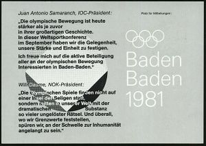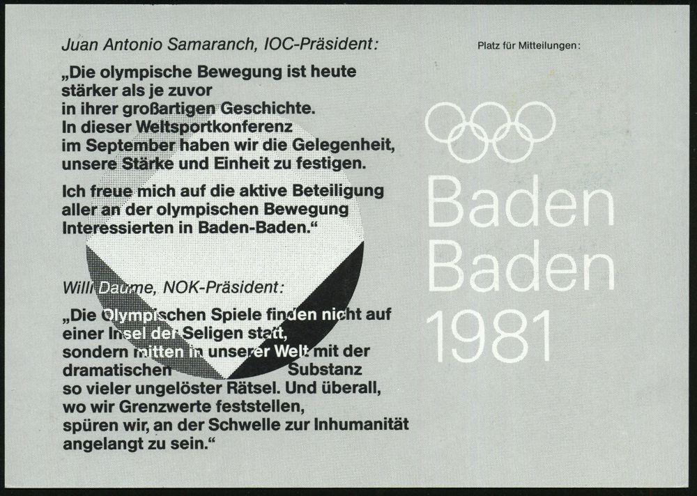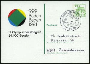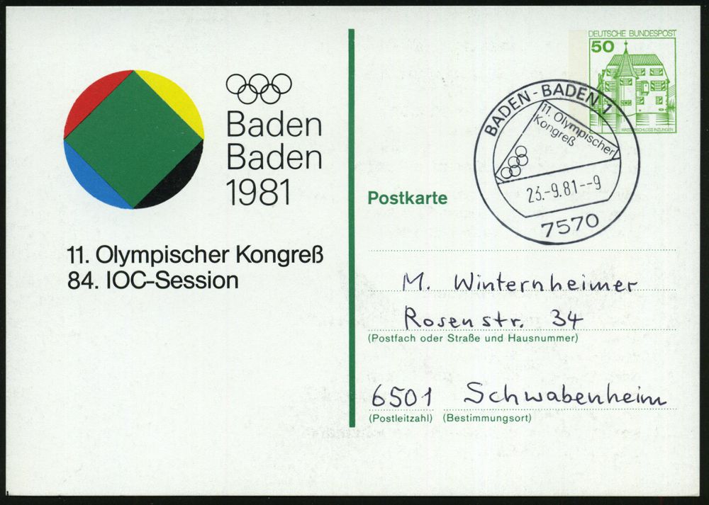 5083 | 12 € | POSTLEITRAUM 7500 (OHNE KARLSRUHE u. PFORZHEIM) : 7570 BADEN-BADEN 1/ 11.Olympischer/ Kongreß 1981 (23.9.) SSt auf PP 50 Pf. Burgen, grün: 11. Olympischer Kongreß / 84. IOC-Session (Logo, Mi.PP 104/110) rs. Zitate Samaranch u. Daume, Inl.-Kt. (Bo.99) | ![]() ![]() | |