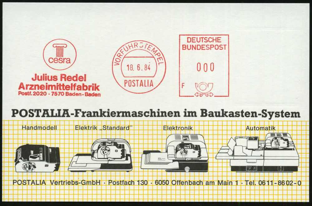 5085 | 16 € | POSTLEITRAUM 7500 (OHNE KARLSRUHE u. PFORZHEIM) : 7570 Baden-Baden 1984 (18.6.) AFS.: VORFÜHRSTEMPEL/POSTLIA/cesra/Juluis Redel/Arzneimittelfabrik.. (Logo: dorische Säule) seltene Postalia-Musterkt.! (= Specimen) | ![]() | |