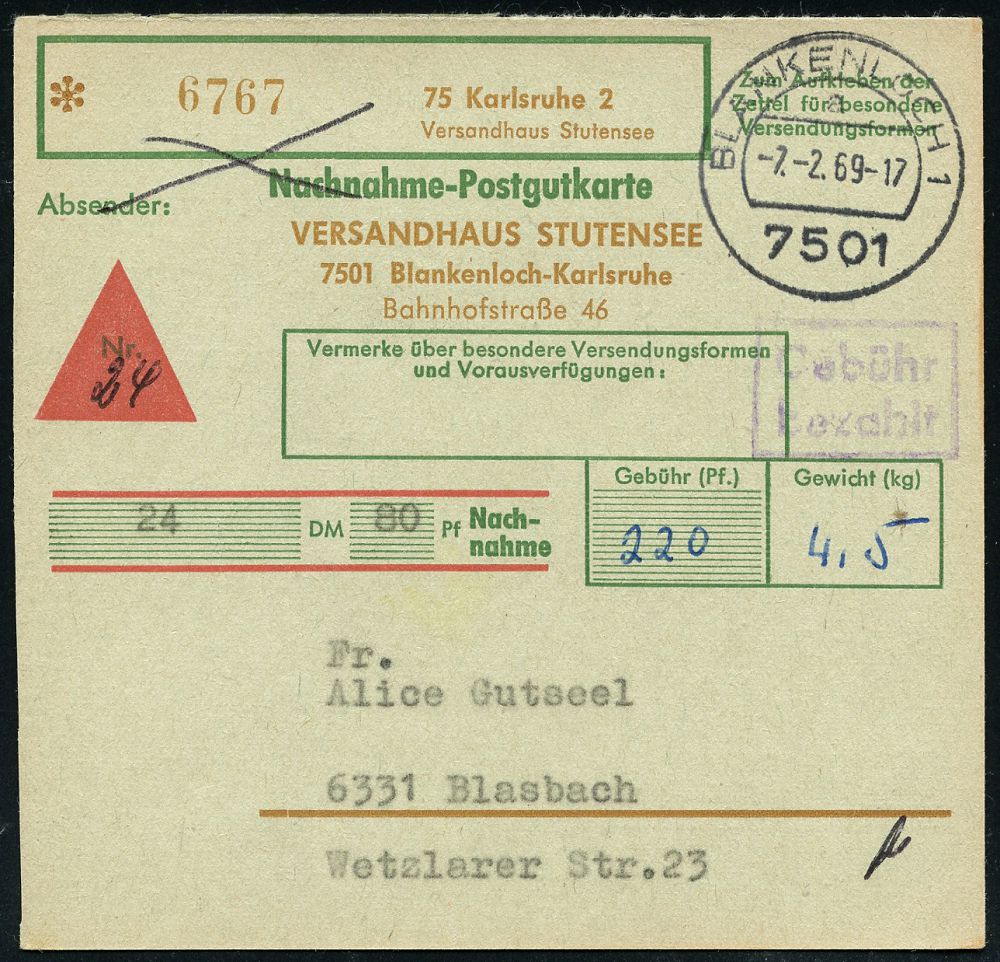 5089 | 14 € | POSTLEITRAUM 7500 (OHNE KARLSRUHE u. PFORZHEIM) : 7501 BLANKENLOCH 1/ a 1969 (7.2.) 1K-Segment auf grüner NN-Selbstbucher-Paketgut-Kt.: 75 Karlsruhe 1, Versandhaus Stutensee.. n. Blasbach | ![]() | |