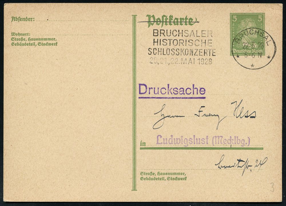 5092 | 18 € | POSTLEITRAUM 7500 (OHNE KARLSRUHE u. PFORZHEIM) : BRUCHSAL/ ***/ BRUCHSALER/ HISTORISCHE/ SCHLOSSKONZERTE/ 20,21,22.MAI 1928 (22.3.) MWSt klar gest. Inl.-Karte (Bo.3 A) | ![]() | |
