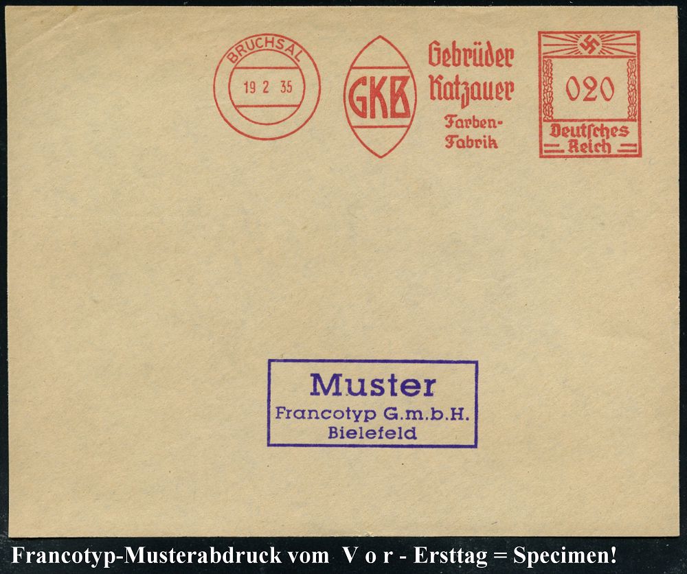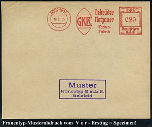 5094 | 35 € | POSTLEITRAUM 7500 (OHNE KARLSRUHE u. PFORZHEIM) : BRUCHSAL/ GKB/ Gebrüder/ Katzauer/ Farben-/ Fabrik 1935 (19.2.) AFS-Musterabdruck Francotyp "Hakenkreiz" (Monogr.-Logo) glasklar gest. Francotyp-Musterblatt vom V o r - Ersttag ! (mit Attest), selten! (Dü.E-3CEh) | ![]() ![]() | |