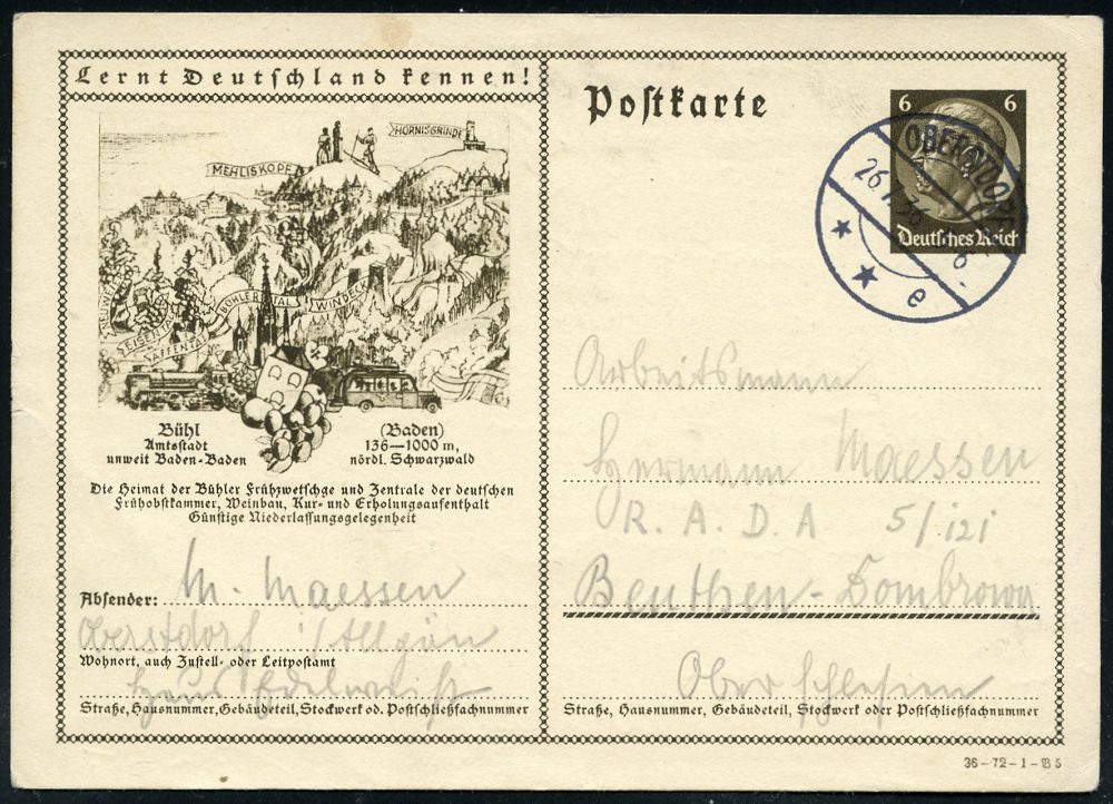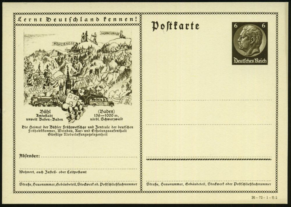 5106 | 10 € | POSTLEITRAUM 7500 (OHNE KARLSRUHE u. PFORZHEIM) : Bühl (Baden) 1936 6 Pf. BiP Hindenbg., braun: Heimat der Bühler Zwetschge.. Weinbau, Kur- u. Erholungsaufenthalt = Skiläufer auf dem Mehliskopf (u. Schwarzwald m. Wein, Pflaumen, Dampflok, Omnibus, Dom etc.) ungebr. (Mi.P 236/36-72-B 5) | ![]() | |