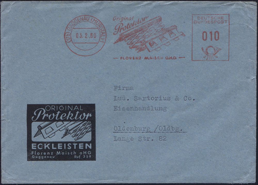 5128 | 16 € | POSTLEITRAUM 7500 (OHNE KARLSRUHE u. PFORZHEIM) : (17b) GAGGENAU (MURGTAL)1/ Original/ Protektor/ FLORENZ MAISCH OHG 1960 (3.2.) AFS Francotyp "Posthorn" (Verputz-Eckleisten) motivgl. Reklame-Bf.!, seltenes Motiv! (Dü.E-23CO) | ![]() | |