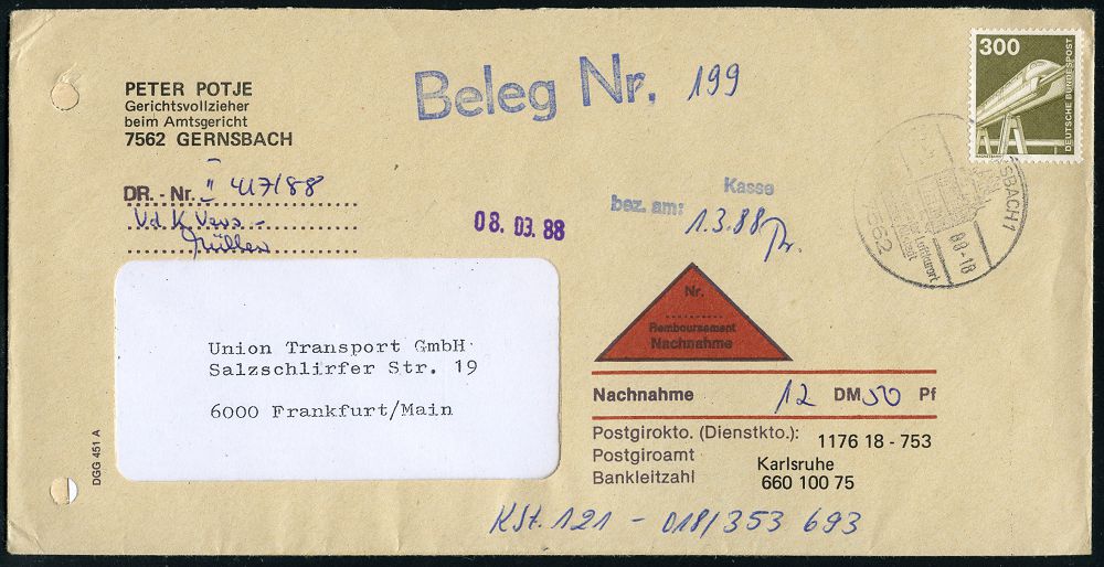 5135 | 12 € | POSTLEITRAUM 7500 (OHNE KARLSRUHE u. PFORZHEIM) : 7562 GERNSBACH/ Luftkurort.. 1987 (Aug.) 300 Pf. Magnet-Schwebebahn, EF sauber gest. (gelochter) Inl.-NN-Bf., seltenes Porto! (Mi.1138 EF + 10.- EUR) | ![]() | |