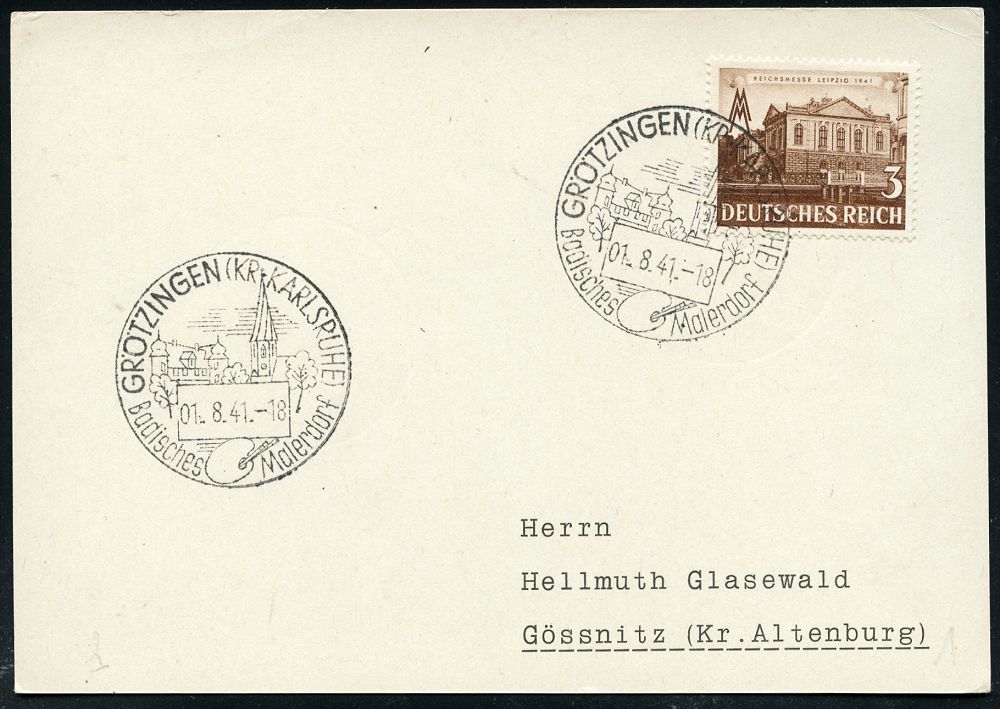 5136 | 15 € | POSTLEITRAUM 7500 (OHNE KARLSRUHE u. PFORZHEIM) : GRÖTZINGEN (KR KARLSRUHE)/ Badisches Malerdorf 1941 (1.8.) HWSt = Palette u. Pinsel (vor Ortsbild mit Kirche) klar gest. Inl.-Karte, ex Glasewald-Slg. (Bo.1 ,Erstjahr!) | ![]() | |