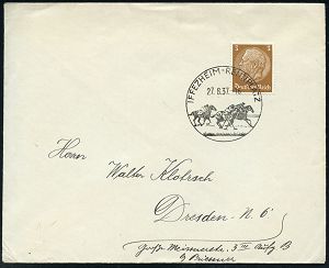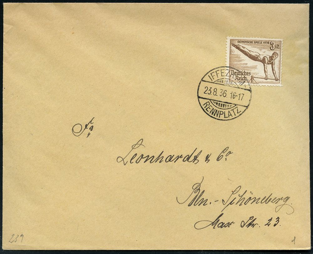 5141 | 18 € | POSTLEITRAUM 7500 (OHNE KARLSRUHE u. PFORZHEIM) : IFFEZHEIM/ RENNPLATZ 1937 (23.8.) SSt = Hauspostamt Galopp-Rennbahn! auf EF 3 + 2 Pf. Olympiade (alte Form: 1K-Gitter) vom Eröffnungstag, klar gest. Inl.-Bf. (Bo.1 /V.Verwend., 1.Tag) | ![]() | |