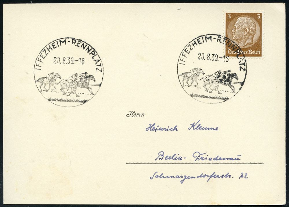 5145 | 16 € | POSTLEITRAUM 7500 (OHNE KARLSRUHE u. PFORZHEIM) : IFFEZHEIM-RENNPLATZ 1939 (20.8.) SSt ohne Text vom Eröffnungs-Renntag (Galopper) klar gest. Inl.-Karte, letzte Renn-Saison vord em Krieg (Bo.2, III. Verwendungung, 1. Tag) | ![]() | |