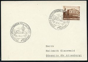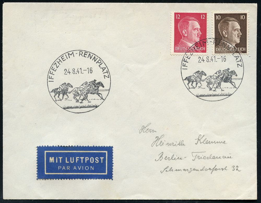 5146 | 25 € | POSTLEITRAUM 7500 (OHNE KARLSRUHE u. PFORZHEIM) : IFFEZHEIM-RENNPLATZ 1941 (24.8.) SSt ohne Text auf Hitler-Frankatur 22 Pf. vom 1. Renntag = Galopper (Rennen wurden kriegsbedingt Sommer 1941 eingestellt!) klar gest. Inl.-Flugpos-Bf. = seltene Verwendung! (Bo.2 , IV. Verwendung = letzte Rennen im Krieg!) | ![]() | |