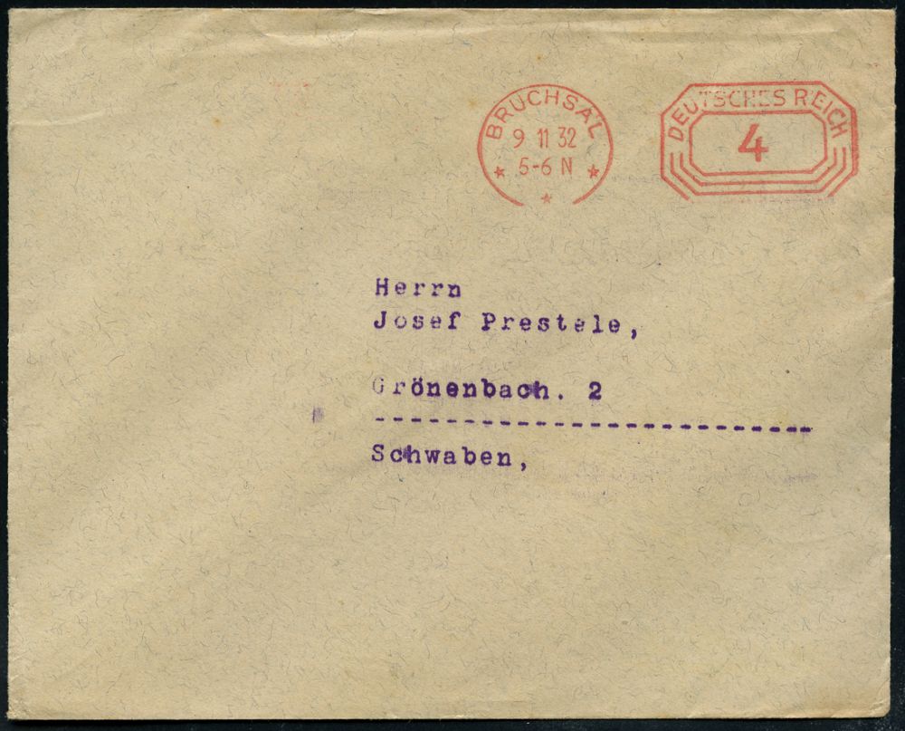 5093 | 8 € | POSTLEITRAUM 7500 (OHNE KARLSRUHE u. PFORZHEIM) : BRUCHSAL/ ***/ DEUTSCHES REICH 1932 (9.11.) PFS "Achteck" 4 Pf. = Tarif bis 30.11.1932 auf Inl.-Drs.-Bf. (Dü.D-4) | ![]() ![]() | |