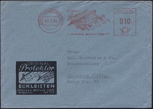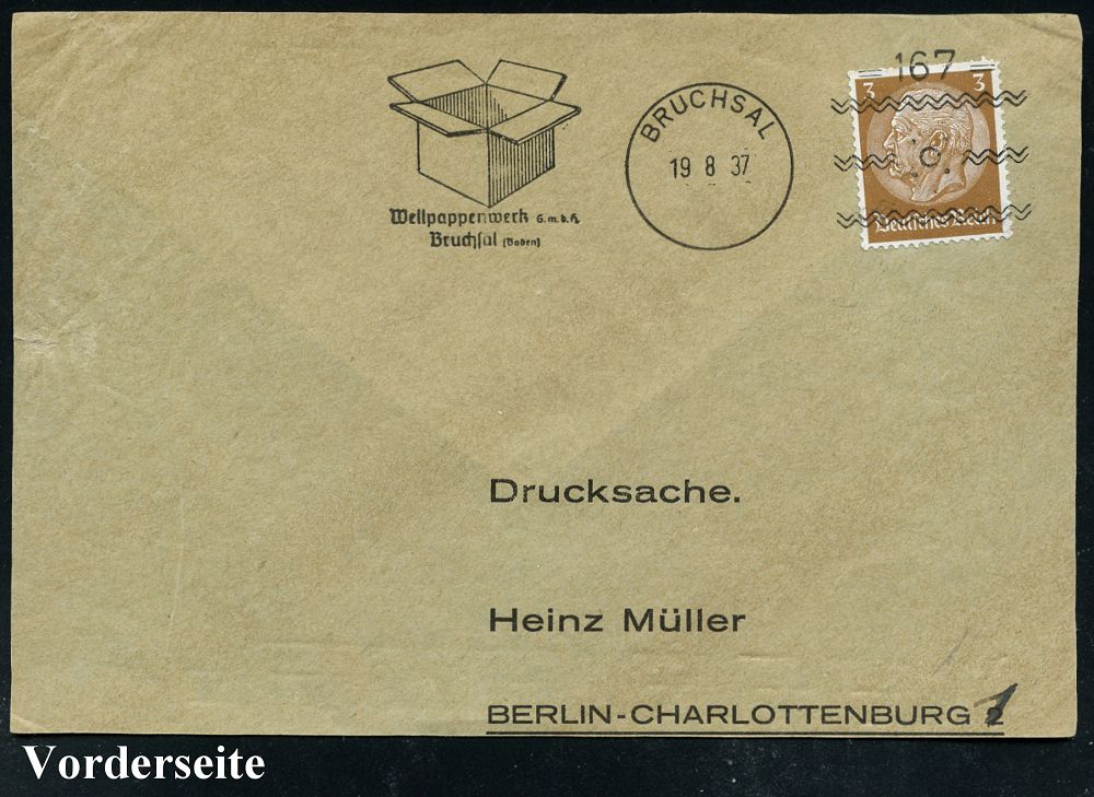 5095 | 30 € | POSTLEITRAUM 7500 (OHNE KARLSRUHE u. PFORZHEIM) : BRUCHSAL/ = 167 =/ Wellpappenwerk GmbH.. 1937 (19.8.) seltener Freimarkenstempel = Frankier- u. Stempelautomat zur Vorausentwertung der Fa. Telefonbau & Normalzeit (Pappkarton) klar gest. , kleine Vorderseite | ![]() | |