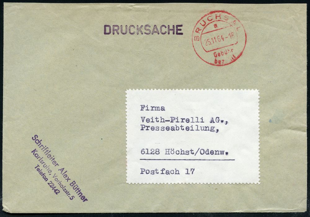 5101 | 18 € | POSTLEITRAUM 7500 (OHNE KARLSRUHE u. PFORZHEIM) : BRUCHSAL/ a/ Gebühr/ bezahlt 1964 (25.11.) ungewöhnliche 1K-Segment PFS ohne PLZ mit Uhrzeit ohne Wertangabe , viol. Abs.-3L: Alex Büttner.., Inl.-Drs.-Bf. (Dürst unbekannt, eigentlich für Paketkarten verwendet) | ![]() | |