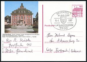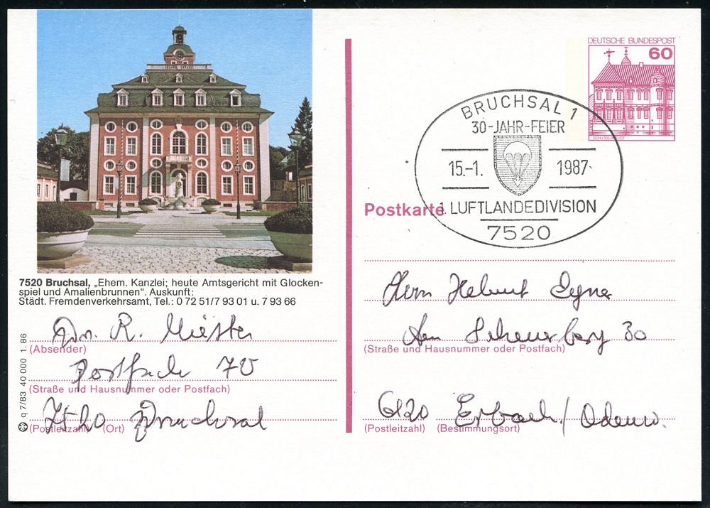 5103 | 14 € | POSTLEITRAUM 7500 (OHNE KARLSRUHE u. PFORZHEIM) : 7520 BRUCHSAL 1/ 30-JAHR-FEIER/ 1.LUFTLANDEDIVISION 1987 (15.1.) SSt = Fallschirm-Wappen auf ortsgleicher BiP 60 Pf. Burgen, lilarot: 7520 Bruchsal, ehem. Kanzlei, heute Amtsgericht mit Glockenspiel , klar gest. Inl.-Karte, seltene Kombination! (Mi.P 138) | ![]() | |