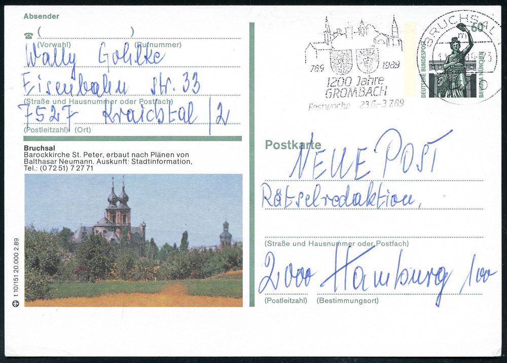 5104 | 14 € | POSTLEITRAUM 7500 (OHNE KARLSRUHE u. PFORZHEIM) : 7520 BRUCHSAL 1/ mf/ 1200 Jahre/ GROMBACH/ Festwoche.. 1989 (11.5.) MWSt auf ortsgleicher BiP 50 Pf. Bavaria: Bruchsal, Barockirche St. Peter.. von Barthasar Neumann.. , Bedarf, seltene Kombination! (Mi.P 139) | ![]() | |