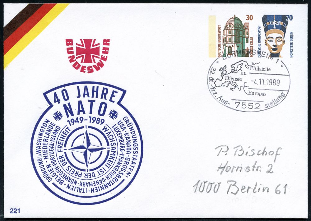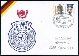 5112 | 12 € | POSTLEITRAUM 7500 (OHNE KARLSRUHE u. PFORZHEIM) : 7552 BURMERSHEIM 1/ ..dt.-frz.Ausstellung 1989 (4.11.) SSt (Europa-Karte) auf PU 30 Pf. Bauwerke + 70 Pf. Nofrete: 40 JAHRE NATO 1949 - 1949 (Nato-Logo) Inl.-Bf. (Mi.PU 302/8) | ![]() | |