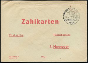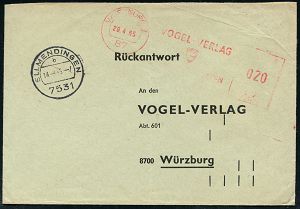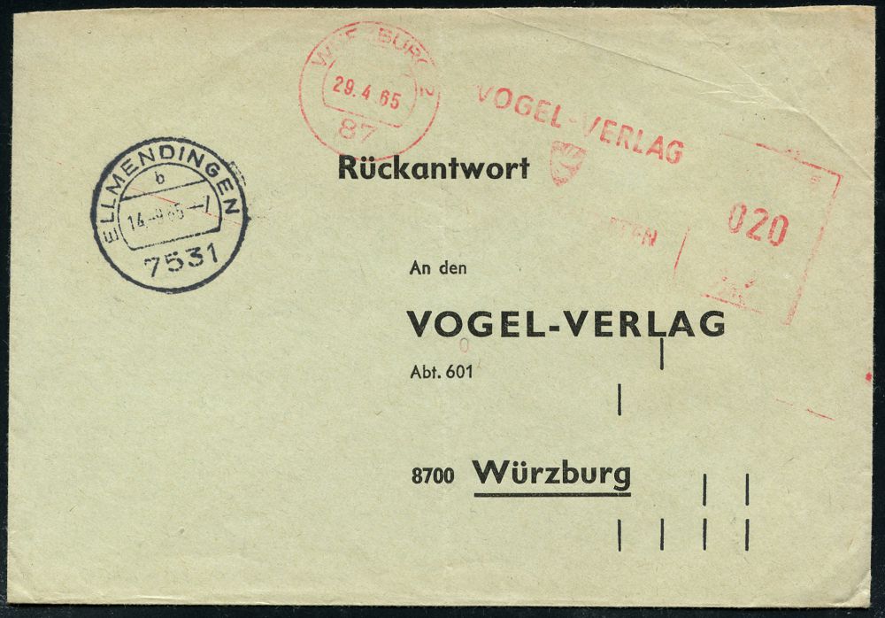 5118 | 12 € | POSTLEITRAUM 7500 (OHNE KARLSRUHE u. PFORZHEIM) : 7531 ELLMENDINGEN/ b 1965 (16.9.) 1K-Segment als Aufgabe-Stpl. auf vorausfrankiertem Antwort-Bf. (daher gefaltet) AFS.: 87 WÜRZBURG 2/ VOGEL VERLAG + schw. Matrix-Codierung | ![]() | |