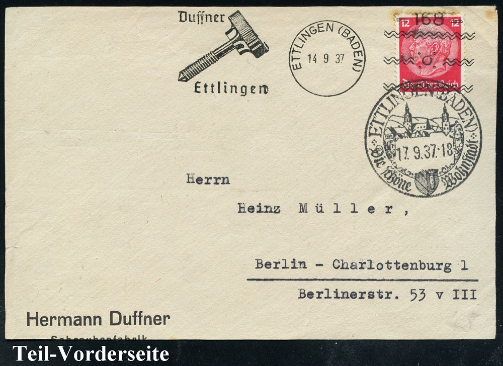5121 | 28 € | POSTLEITRAUM 7500 (OHNE KARLSRUHE u. PFORZHEIM) : ETTLINGEN (BADEN)/ = 168 =/ Duffner/ Ettlingen 1937 (14.9.) seltener Freimarkenstempel mit Kennung = Frankier- u. Stempelautomat zur Vorausentwertung, Abb.: Schraube (der Fa. Telefonbau & Normalzeit) + HWSt: ETTLINGEN (BADEN)/ Die schöne Wohnstadt vom 17.9. nachentwertet (Bo. 1) Bedarfs-Teil-Vorderseite | ![]() | |