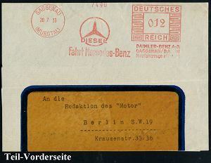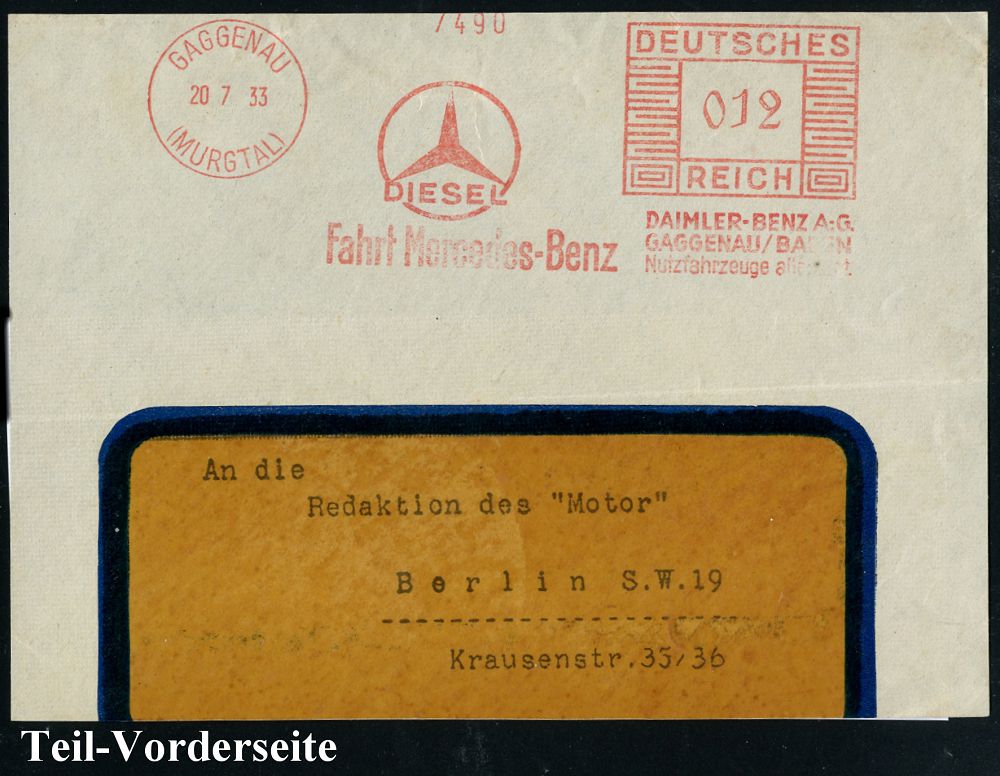 5125 | 15 € | POSTLEITRAUM 7500 (OHNE KARLSRUHE u. PFORZHEIM) : GAGGENAU/ (MURTTAL)/ DIESEL/ Fahrt Mercedes-Benz.. 1933 (20.7.) AFS Francotyp "Mäanderrechteck" (Mercedes-Sternlogo) = LKW-Fabrik, Teil-Vorderseite (Dü.E-2CEh) | ![]() | |