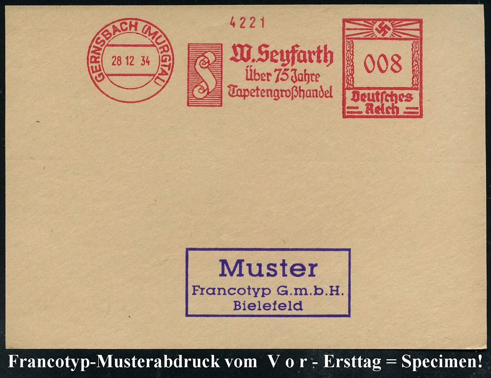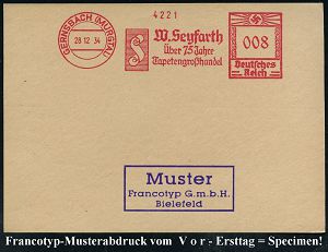 5131 | 35 € | POSTLEITRAUM 7500 (OHNE KARLSRUHE u. PFORZHEIM) : GERNSBACH (MURGTAL)/ W.Seyfarth/ Über 75 Jahre/ Tapetengroßhandel 1934 (28.12.) AFS-Musterabdruck Francotyp "Hakenkreuz" (Monogr.-Logo) glasklar gest. Francotyp-Musterblatt vom V o r - Ersttag ! (mit Attest), selten! (Dü.E-3CEh) | ![]() ![]() | |