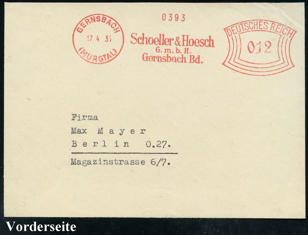 5132 | 25 € | POSTLEITRAUM 7500 (OHNE KARLSRUHE u. PFORZHEIM) : GERMSBACH/ (MURGTAL)/ Schoeller & Hoesch/ G.m.b.H./ Gernsbach Bd. 1935/37 2 verschiedene AFS Francotyp "Bogenrechteck", 1x "G.m.b.H". entfernt ! (= Papierfabrik) 2 Bedarfs-Vorderseiten, 2 Belege, vergl. Kat.-Nr. 5134 (Dü.E-1CEh) | ![]() ![]() | |