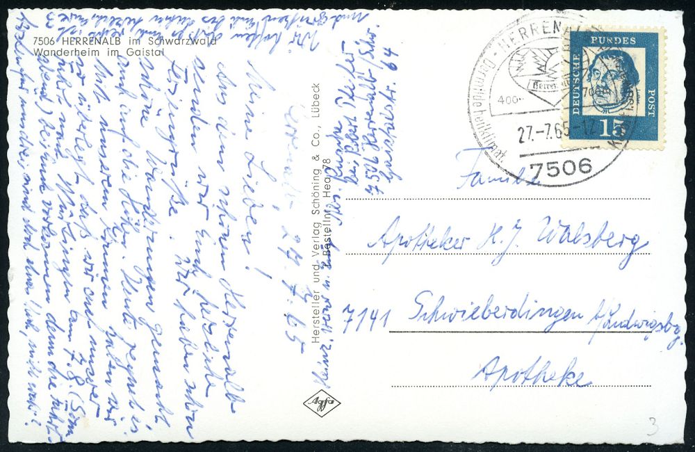 5139 | 15 € | POSTLEITRAUM 7500 (OHNE KARLSRUHE u. PFORZHEIM) : 7506 HERRENALB/ Der milde heilklimat.Kurort.. 1965/66 je SSt je auf s/w.-Foto-Ak.: Wanderheim im Gaistal bzw. Kirche , je Bedarf (Einzelverkauf möglich: je 8.- EUR), 2 Belege (Bo.3) | ![]() ![]() ![]() ![]() | |