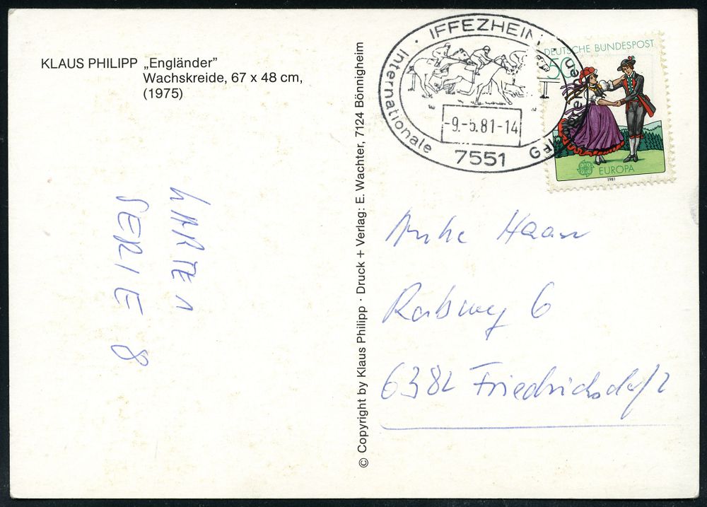 5152 | 12 € | POSTLEITRAUM 7500 (OHNE KARLSRUHE u. PFORZHEIM) : 7551 IFFEZHEIM/ Internatiionale Galopprennen 1981 (9.5.) SSt = Galopper auf passender Künstler-Color-Ak.: "Engländer" (von Klaus Philipp, Inl.-Karte, schöne Kombination! (Bo.6) | ![]() ![]() | |