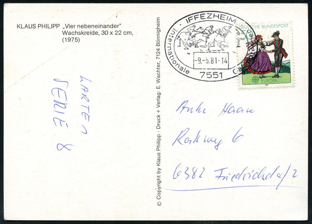 5153 | 12 € | POSTLEITRAUM 7500 (OHNE KARLSRUHE u. PFORZHEIM) : 7551 IFFEZHEIM/ Internatiionale Galopprennen 1981 (9.5.) SSt = Galopper auf passender Künstler-Color-Ak.: "Vier nebeneinander" (von Klaus Philipp, Inl.-Karte,, schöne Kombination! (Bo.6) | ![]() ![]() | |