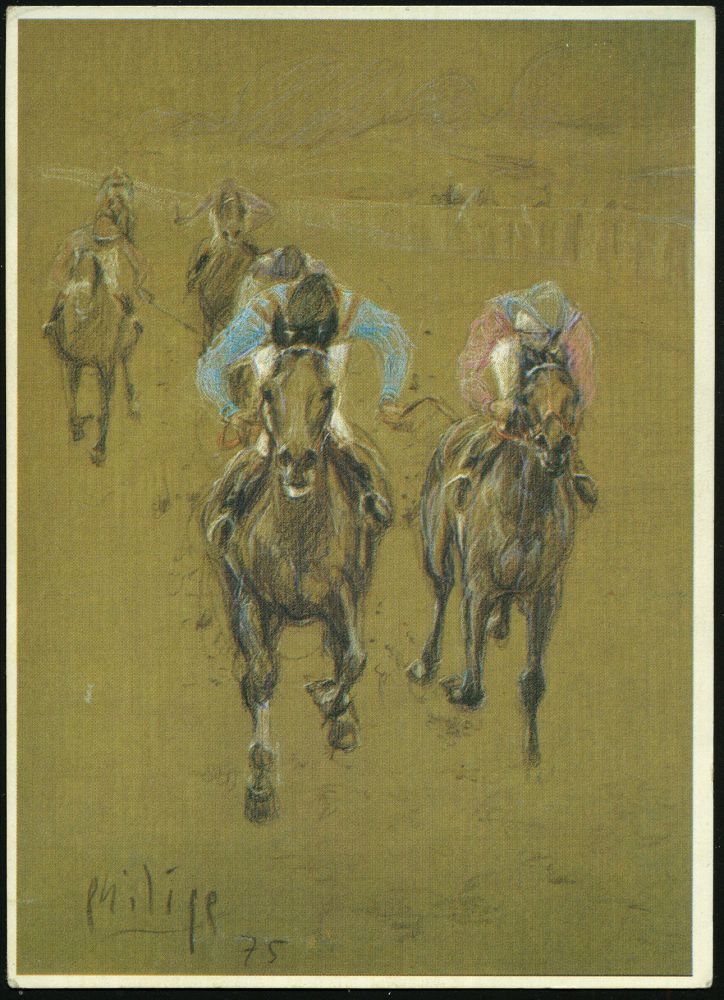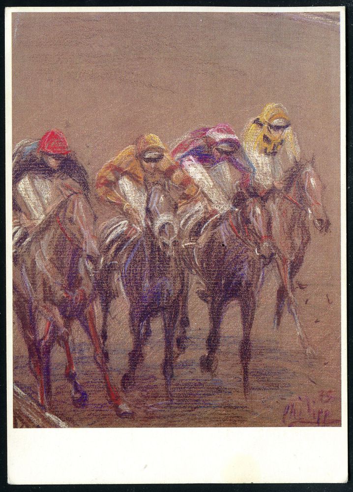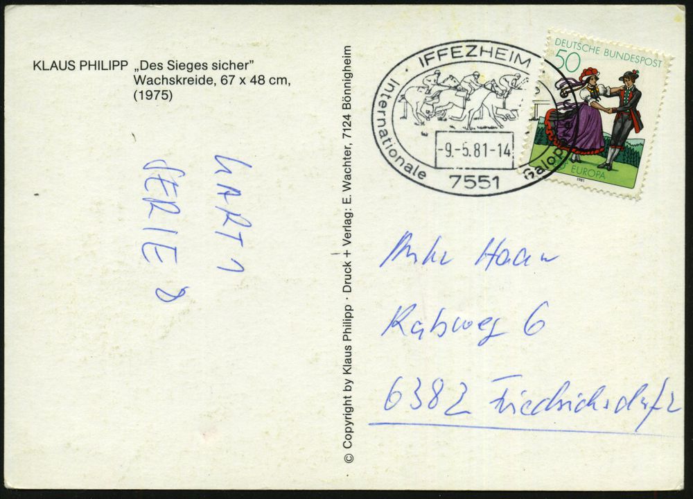 5155 | 12 € | POSTLEITRAUM 7500 (OHNE KARLSRUHE u. PFORZHEIM) : 7551 IFFEZHEIM/ Internatiionale Galopprennen 1981 (9.5.) SSt = Galopper auf passender Künstler-Color-Ak.: "Ds Sieges sicher" (von Klaus Philipp, Inl.-Karte,, schöne Kombination! (Bo.6) | ![]() ![]() | |