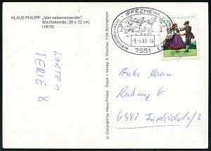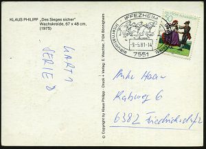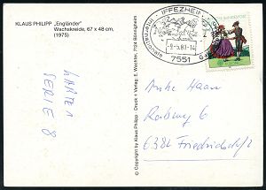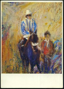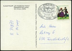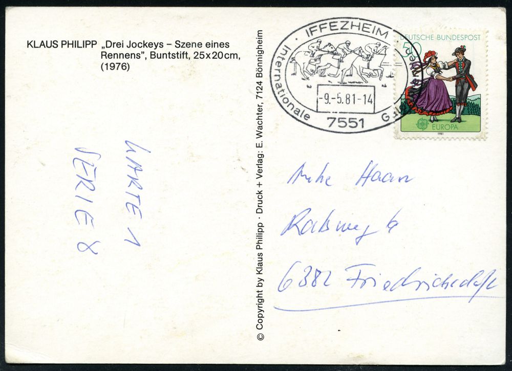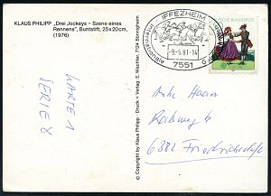 5150 | 12 € | POSTLEITRAUM 7500 (OHNE KARLSRUHE u. PFORZHEIM) : 7551 IFFEZHEIM/ Internatiionale Galopprennen 1981 (9.5.) SSt = Galopper auf passender Künstler-Color-Ak.: "Die Waldfrieder Farben" (Jockey uf seinem Pferd u. Tainer von Klaus Philipp, Inl.-Karte, schöne Kombination! (Bo.6) | ![]() ![]() | |