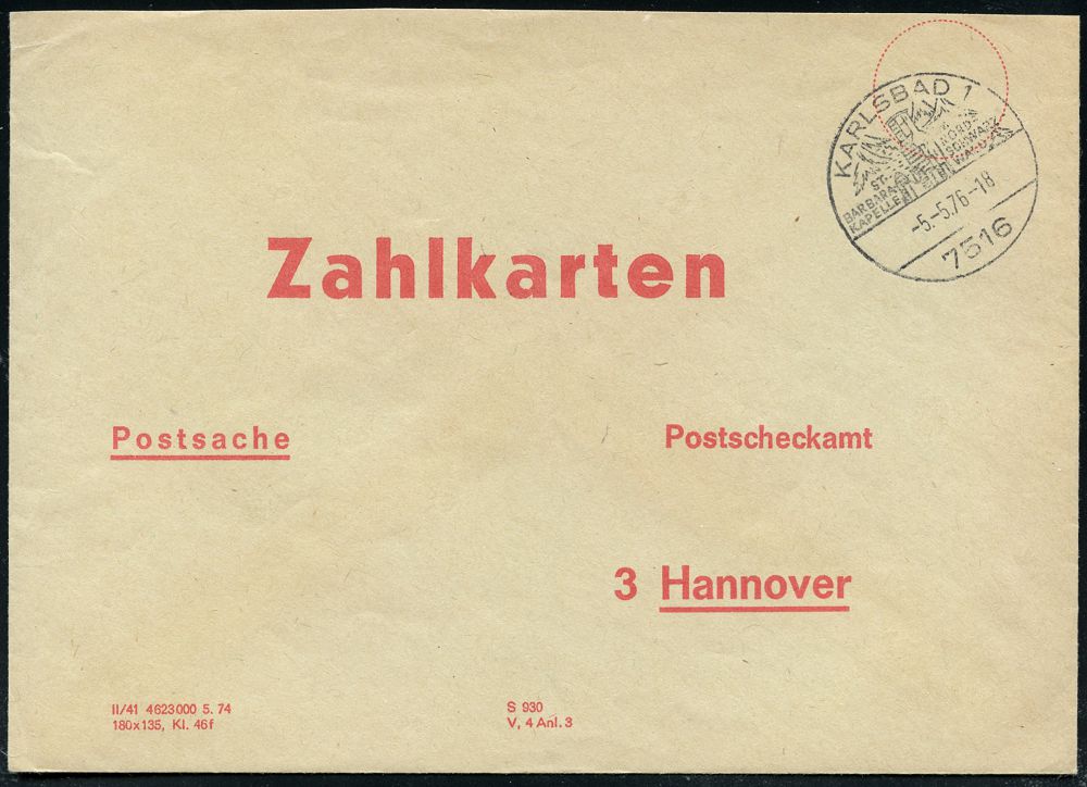 5159 | 15 € | POSTLEITRAUM 7500 (OHNE KARLSRUHE u. PFORZHEIM) : 7516 KARLSBAD 1/ ST./ BARBARA-/ KAPELLE.. 1976 (5.5.) HWSt (Ortsbild) auf portofreien PSch-Innendienst-Bf.: Zahlkarte.. (für Zahlkartenaustausch) seltene Verwendung! | ![]() | |