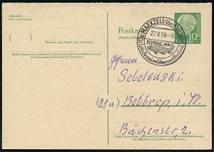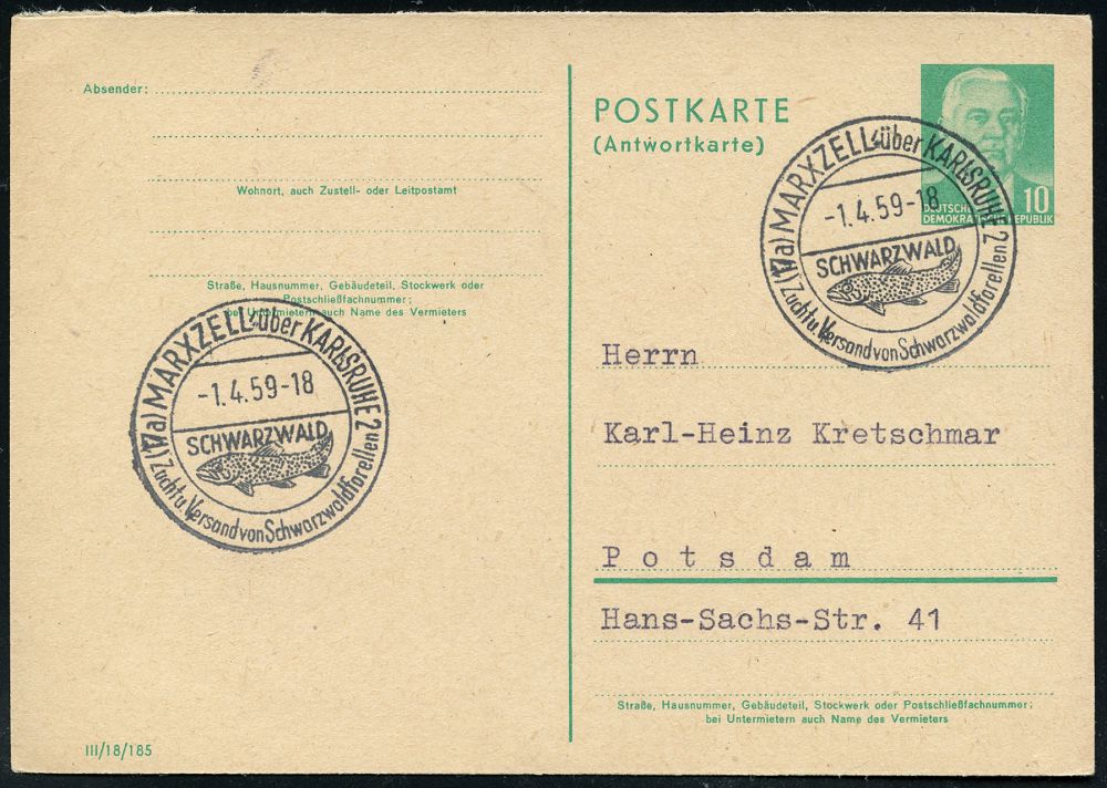5162 | 15 € | POSTLEITRAUM 7500 (OHNE KARLSRUHE u. PFORZHEIM) : (17a) MARXZELL über KARLSRUHE 2/ Zucht u.Versand v.Schwarzwaldforellen 1959 (1.4.) HWSt (Forelle) auf DDR-Antwort-P. 10 Pf. Pieck n. Potsdam, zulässige u. seltene Verwendung! (Bo.4) | ![]() | |