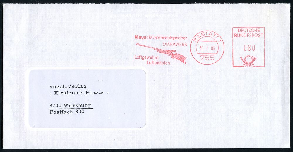 5185 | 12 € | POSTLEITRAUM 7500 (OHNE KARLSRUHE u. PFORZHEIM) : 755 RASTATT 1/ Mayer & Grammelspacher/ DIANAWERK/ Luftgewehre/ Luftpistolen 1986 AFS Postalia (Luftgewehr) rs. Abs.-Vordruck, Inl.-Bf. (Dü.E-26 B) | ![]() | |