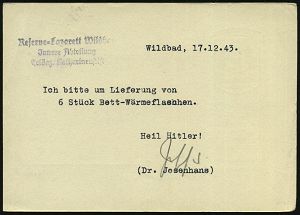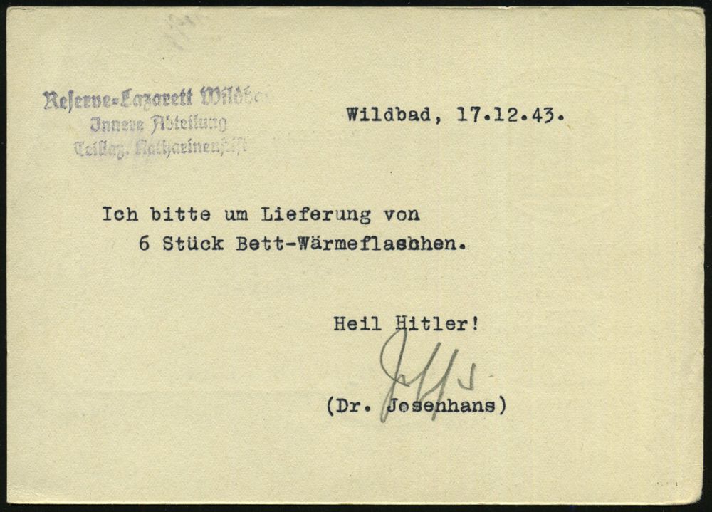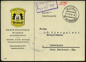 5205 | 18 € | POSTLEITRAUM 7500 (OHNE KARLSRUHE u. PFORZHEIM) : WILDBAD/ IM SCHWARZWALD 1943 (17.12.) 2K-Steg + viol. 1K-HdN: Reservelazarett/Wildbad + rs. 3L: Reserve-Lazarett Wildbad /Jnnere Abteilung/Teillaz. Katharinenstift , zweifarbige, kommunale Reklame-Kt.: Wildbad..RHEUMA - GICHT - ISCHIAS / VERLETZUNGSFOLGEN.. (Wappen) seltene Feldpost-Kt. | ![]() ![]() | |