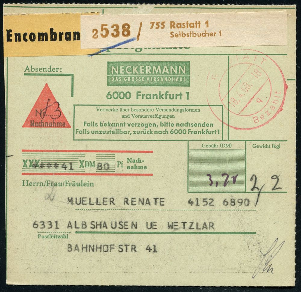 5175 | 16 € | POSTLEITRAUM 7500 (OHNE KARLSRUHE u. PFORZHEIM) : RASTATT/ q/ Bezahlt 1968 (18.4.) roter 1K-Segment ohne PLZ mit Uhrzeit + brauner Selbstbucher-Paketzettel: 755 Rastatt 1/ Selbstbucher , grüne Inl.-Selbstbucher-NN-Paketgut-Kt.: NECKERMANN, 6000 Frankfurt 1 n. Abshausen (Dürst unbekannt) | ![]() | |