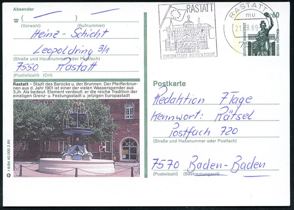 5183 | 14 € | POSTLEITRAUM 7500 (OHNE KARLSRUHE u. PFORZHEIM) : 7550 RASTATT 1/ mu/ ..EUROPASTADT BAROCKSTADT 1989 (21.8.) MWSt (Schloß, Rathaus, Europa-Flagge) auf ortsgleicher BiP 60 Pf. Bavaria: Rastatt - Der Pfeifferbrunnen.. (Mi.P 139/t 6-84) Bedarf !, seltene Kombination! (Bo.32 A) | ![]() | |