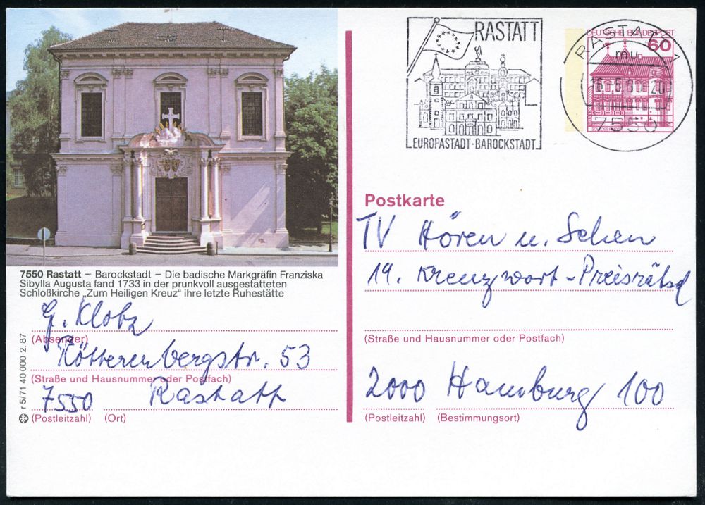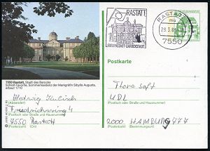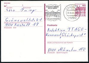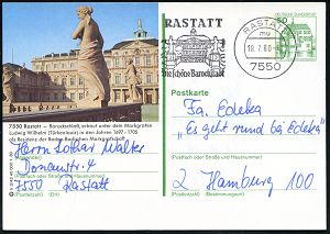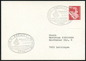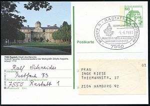 5178 | 14 € | POSTLEITRAUM 7500 (OHNE KARLSRUHE u. PFORZHEIM) : 7550 RASTATT 1/ GEDENKJAHR../ FRANZISKA SIBYLLA AUGUSTA.. 1983 (5.6.) SSt auf orts- u. motiv-passender BiP 50 Pf. Burgen: Schloß Favorite, Sommerresidenz Markgräfin Sibylla Augusta, erbaut 1710 (Mi.P 134/j 6-92) Inl.-Karte, seltene Kombination! (Bo.25) | ![]() | |