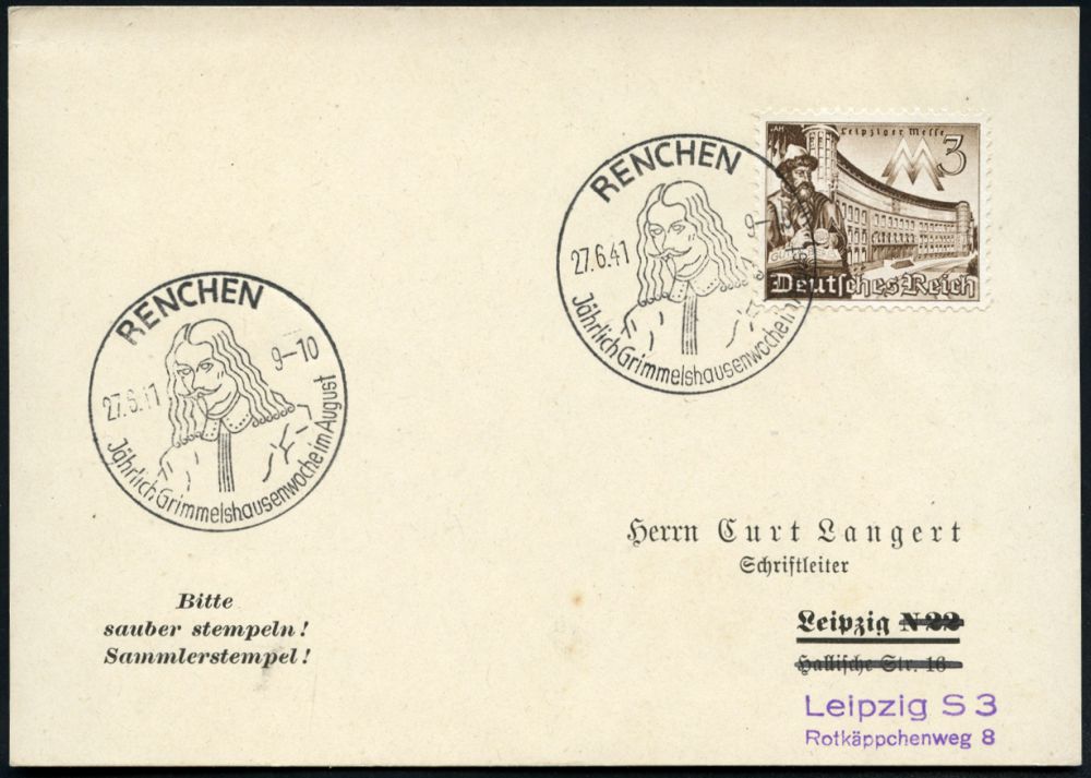 5187 | 16 € | POSTLEITRAUM 7500 (OHNE KARLSRUHE u. PFORZHEIM) : RENCHEN/ Jährlich Grimmelshausenwoche im August 1941 (Juni) HWSt = Brustbild Grimmelshausen , klar gest. Inl.-Karte (Bo.2 , Type I = Erstjahr!) | ![]() | |