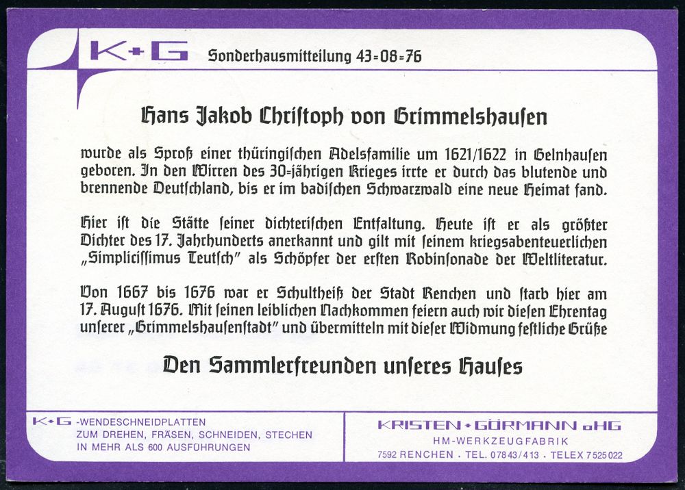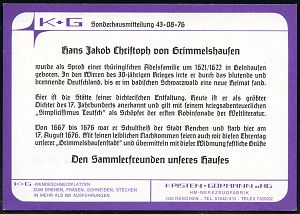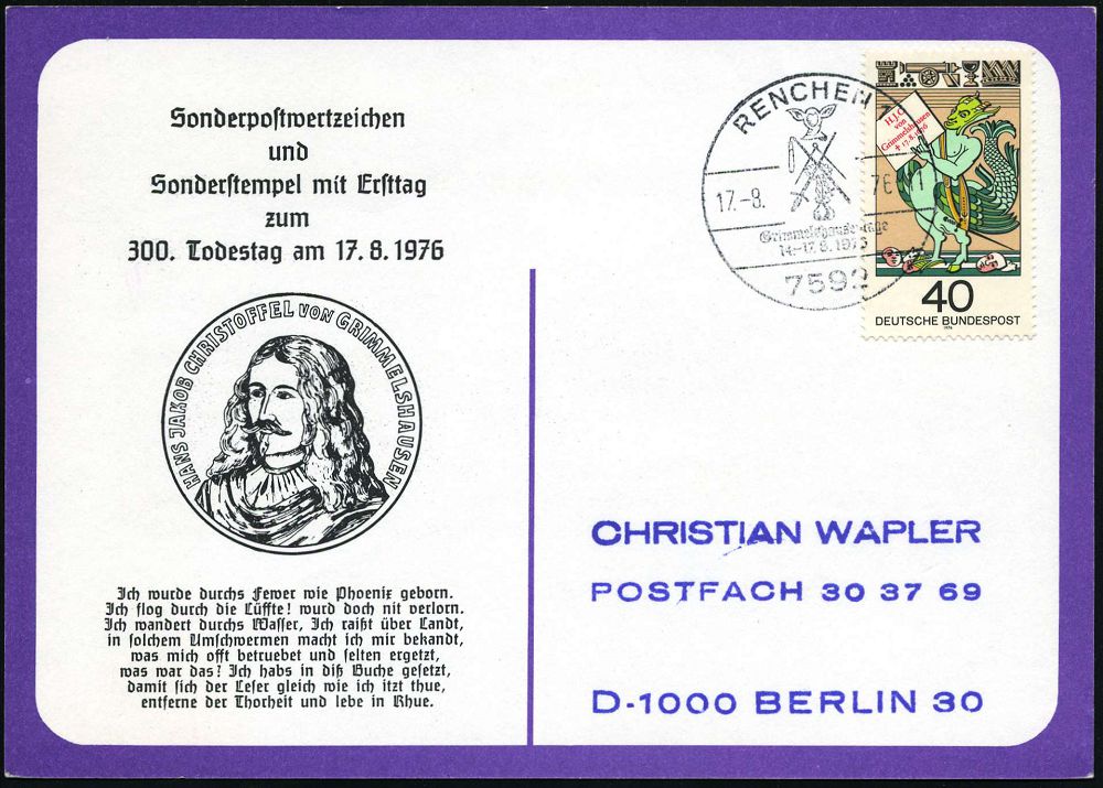 5188 | 15 € | POSTLEITRAUM 7500 (OHNE KARLSRUHE u. PFORZHEIM) : 7592 RENCHEN/ Grimmelshausentage 1976 (17.8.) SSt (= Grimmelshausen-Wappen) auf EF 40 Pf. Grimmelshausen (Mi.402 EF), Jubil.-Sonderkarte! (Bo.5 , nur 22 Tage verwendet) | ![]() ![]() | |