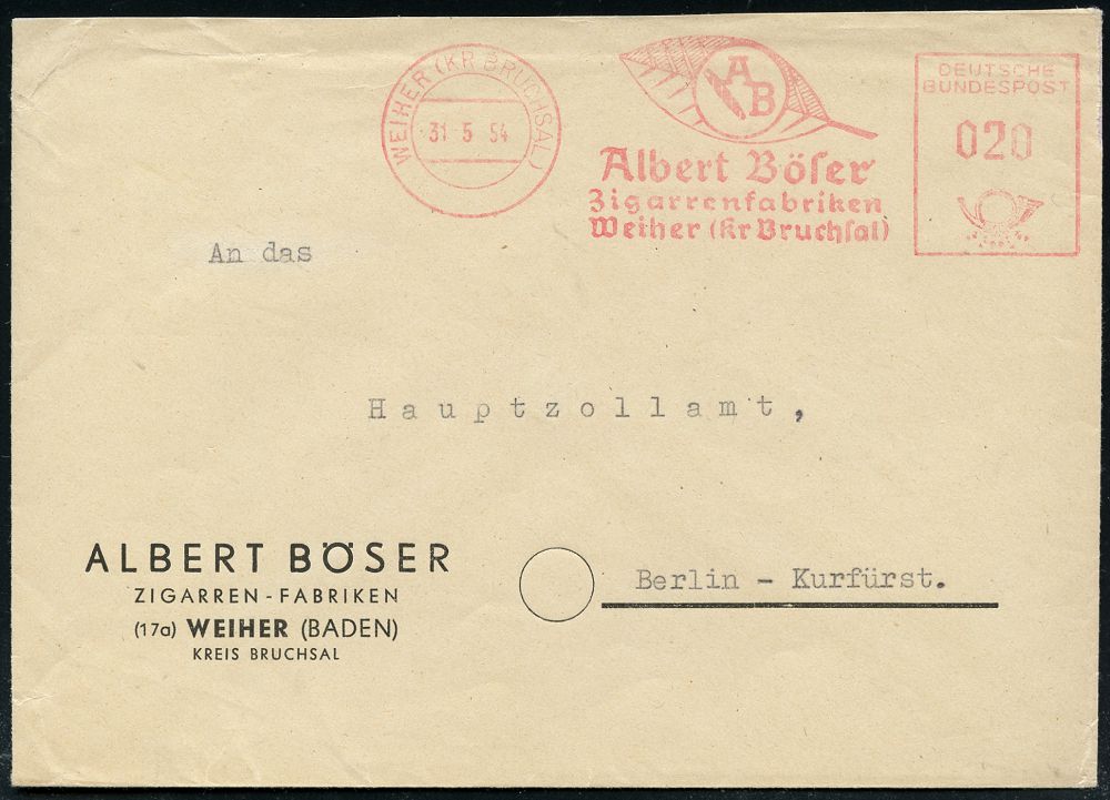 5199 | 14 € | POSTLEITRAUM 7500 (OHNE KARLSRUHE u. PFORZHEIM) : WEIHER (KR BRUCHSAL)/ AB/ Albert Böser/ Zigarrenfabriken.. 1954 (31.5.) AFS Francotyp (Tabakblatt) Firmen-Bf.: ALBERT BÖSER.. notopferbefreit n. West-Berlin (Dü.E-23CGo) | ![]() | |