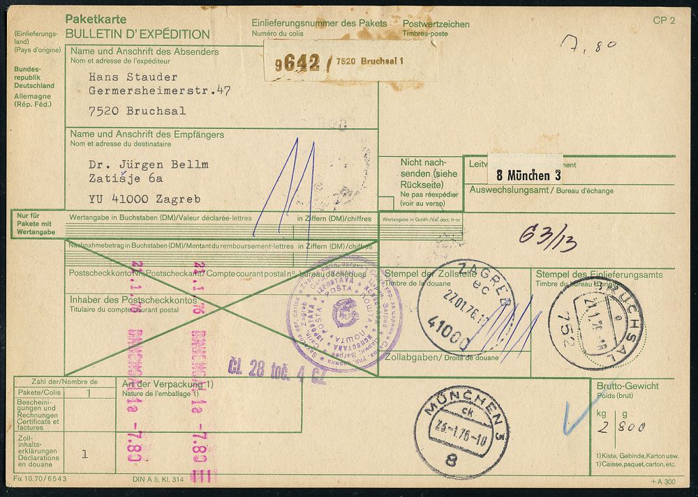 5102 | 18 € | POSTLEITRAUM 7500 (OHNE KARLSRUHE u. PFORZHEIM) : BRUCHSAL 1a 1976 (21.1.) lila Registrierkassen-Paket-FS -7.80 + brauner Paketzettel: 7520 Bruchsal 1 + 1K-Segment: 752 BRUCHSAL/e, Ausl.-Paketkt. n. Zagreb, rs. jugoslaw. Portomarken (Dü.H-1B) | ![]() ![]() | |