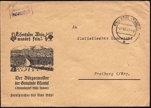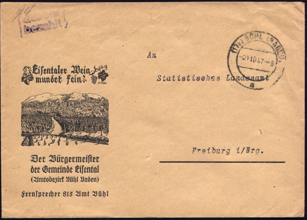5109 | 15 € | POSTLEITRAUM 7500 (OHNE KARLSRUHE u. PFORZHEIM) : (17a) BÜHL (BADEN)/ a 1947 (21.10.) gr. 2K-Steg + viol. Ra.2: Gebühr/bezahlt auf kommunalem Reklame-Bf.: Eisentaler Wein/ mundet fein, Der Bürgermeister.. (Weinberge) n. Freiburg/Br. | ![]() | |