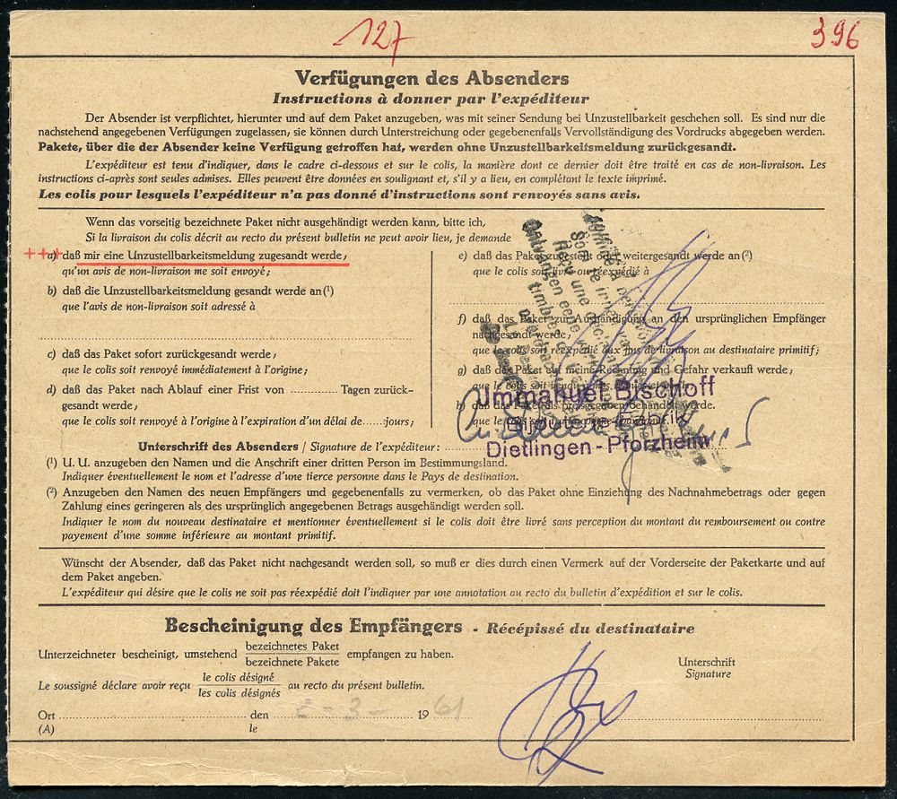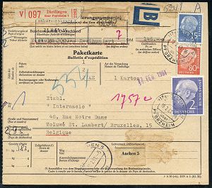 5115 | 20 € | POSTLEITRAUM 7500 (OHNE KARLSRUHE u. PFORZHEIM) : (17a) DIETLINGEN/ a/ über/ PFORZHEIM 1961 (16.2.) 2K-Steg 2x = PSt.I + roter Wertpaketzettel: V Dietlingen/über Pforzheim 1 (Leimfleckchen) , satzreine Frankatur Heuss I 295 Pf. + Klebezettel "B" = Beutelstück, Ausl.-Paketkt. n. Belgien (Mi.184, 195, 264, + 25.- EUR) | ![]() ![]() | |