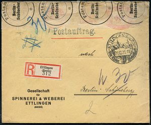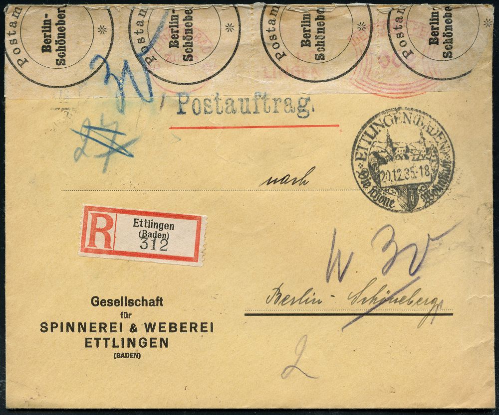 5120 | 28 € | POSTLEITRAUM 7500 (OHNE KARLSRUHE u. PFORZHEIM) : ETTLINGEN(BADEN)/ SPINNEREI/ ETTLINGEN 1935 (20.12.) AFS 062 Pf. + HWSt: ETTLINGEN (BADEN)/Die schöne Wohnstadt (Bo.1) + RZ: Ettlingen/(Baden), Firmen-Bf.: Ges. für SPINNEREI & WEBEREI, + 4x Verschlußzettel: Postamt/Berlin-/Schöneberg , .- Inl.-Postauftrags-R-Bf.!, seltenes Porto! (Dü.E-1BAh) | ![]() ![]() | |