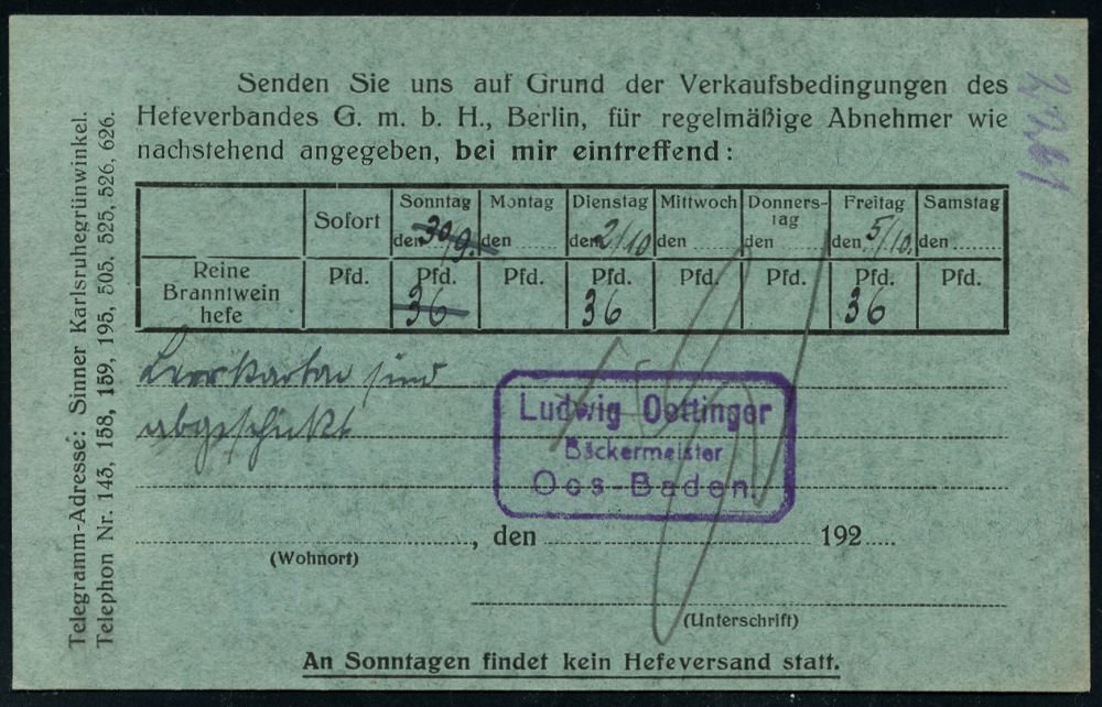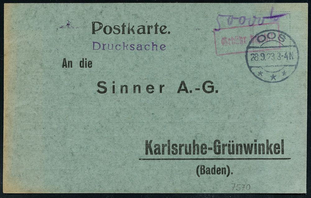5088 | 18 € | POSTLEITRAUM 7500 (OHNE KARLSRUHE u. PFORZHEIM) : Bad Oos 1923 (28.9.) 1K-Brücke: OOS/*** + roter Ra: Gebühr bezahlt + hs. "50 000" (Mk.) Infla-Antwortkt. der Sinner-Ag (= Hefe-Versand) n. Karlsruhe | ![]() ![]() | |