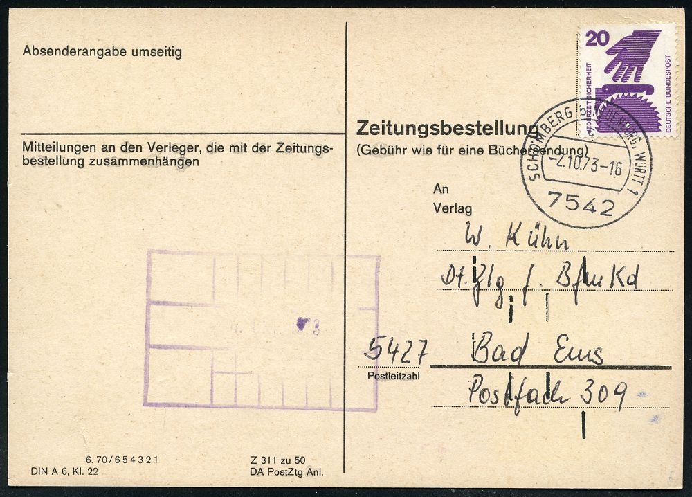 5194 | 25 € | POSTLEITRAUM 7500 (OHNE KARLSRUHE u. PFORZHEIM) : 7542 SCHÖMBERG b NEUENBÜRG, WÜRTT 1/ c 1973 (2.10.) 1K-Segment auf EF 20 Pf. Unfall, = seltene Portostufe "Zeitungsbestellung" + schw. Matrix-Code (= AEG-Telefunken-Sortieranlage) n. Bad Ems (Mi.696 EF) | ![]() | |